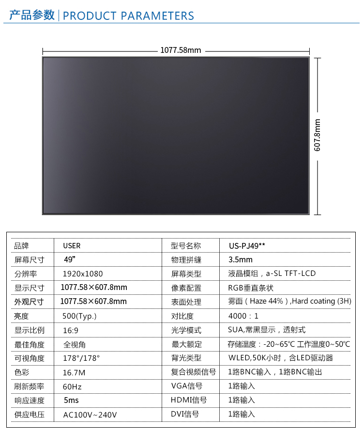 菜單產(chǎn)品中心Product center 液晶廣告機 壁掛式廣告機 落地立式廣告機 電梯超薄廣告機 車載廣告機 高亮廣告機 戶外廣告機 液晶拼接屏 專業(yè)液晶拼接屏 4K液晶拼接屏 廣告拼接屏 無縫液晶拼接屏 觸摸液晶拼接屏 LED顯示屏 觸控一體機 壁掛式觸控一體機 立式觸控一體機 斜面觸控一體機 智能家居觸控一體機 戶外觸控一體機 液晶電子白板 教育電子白板 會議電子白板 工控一體機 觸摸顯示器 紅外觸摸顯示器 電容觸摸顯示器 電阻觸摸顯示器 聲波觸摸顯示器 納米觸摸顯示器 液晶監(jiān)視器 專業(yè)級監(jiān)視器 4K監(jiān)視器 嵌入式監(jiān)視器 機架式監(jiān)視器 開放式監(jiān)視器 SDI監(jiān)視器 高亮監(jiān)視器 廣播級監(jiān)視器 工業(yè)顯示器 4K顯示器 機架式顯示器 開放式顯示器 醫(yī)療顯示器 KVM顯示器 指揮室顯示器 智慧校園產(chǎn)品 專業(yè)定制商顯 多屏廣告機 多功能觸控一體機 多功能廣告機 微信打印廣告機 魔鏡廣告機 透明廣告機 全息廣告機 條形屏廣告機 旋轉(zhuǎn)廣告機 裸眼3D廣告機 人工智能產(chǎn)品 顯示配套設(shè)備 拼接配套設(shè)備 廣告機播放盒 OPS播放盒 拼接支架 移動支架 相關(guān)軟件 吊頂支架 線材 木架 蜂窩箱 桌面底座 熱門產(chǎn)品 →優(yōu)色3.5mm超窄邊46寸液晶拼接屏→優(yōu)色49寸3.5mm超窄邊液晶拼接屏→優(yōu)色3.5mm超窄邊55寸液晶拼接屏 您的位置:首頁 → 公司產(chǎn)品 → 液晶拼接屏 → 專業(yè)液晶拼接屏 優(yōu)色49寸3.5mm超窄邊液晶拼接屏類別:專業(yè)液晶拼接屏 簡介:◆ 型號:US-PJ49** ◆類型:三星/LG/京東方BOE面板 ◆亮度:500-700cd/m2(可選) ◆超窄邊設(shè)計,拼縫3.5mm ◆ 在ISO9001嚴格的質(zhì)量控制體系下生產(chǎn)? ◆ 色彩均勻,圖像穩(wěn)定,為拼接大畫面定制... 在線咨詢 返回列表 產(chǎn)品說明 相關(guān)產(chǎn)品 優(yōu)色1.7mm超窄邊55寸液晶拼接屏 優(yōu)色49寸1.8mm超窄邊液晶拼接墻 優(yōu)色49寸3.5mm超窄邊液晶拼接屏 優(yōu)色3.5mm超窄邊55寸液晶拼接屏 優(yōu)色3.5mm超窄邊46寸液晶拼接屏 優(yōu)色5.3mm超窄邊55寸液晶拼接屏